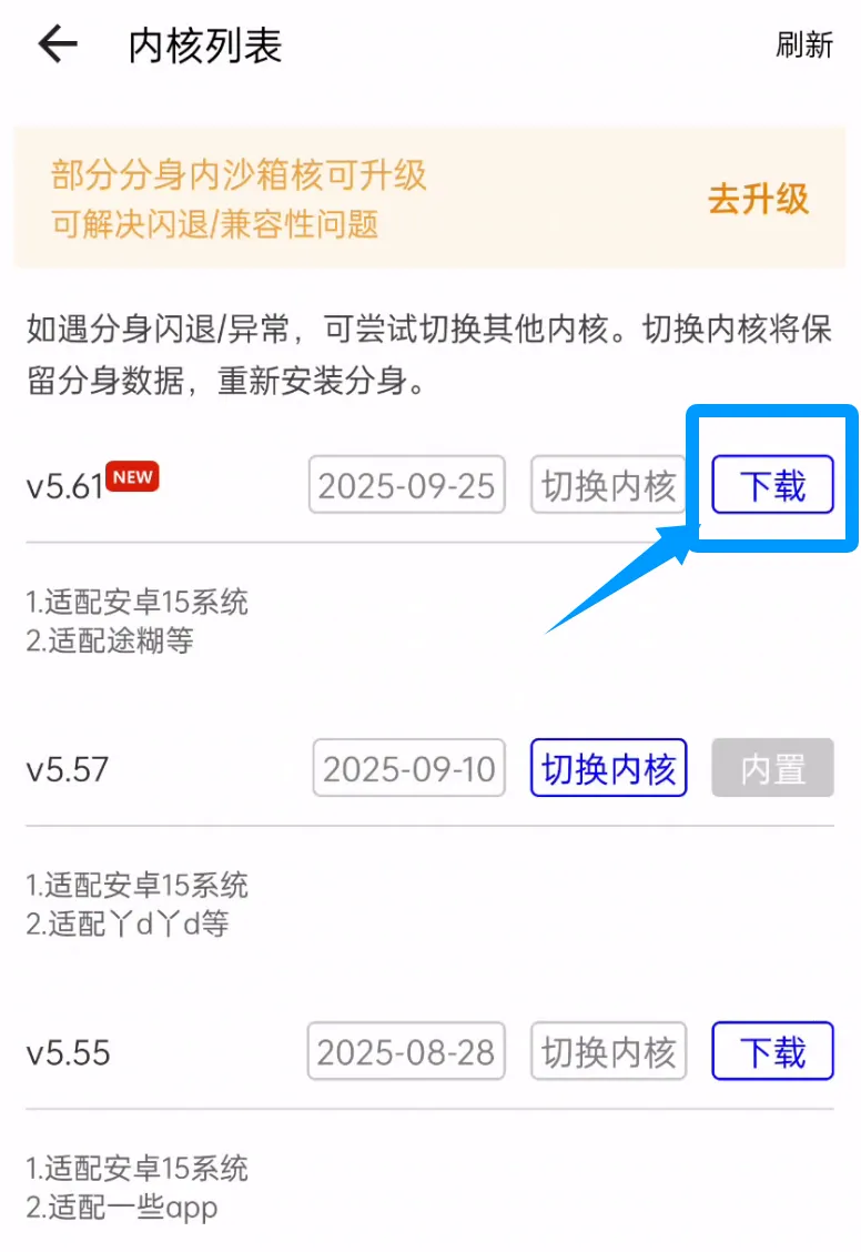 安装完成后,返回芒果君应用的首页,并再次点击该分身的图标。在分身的详细设置页面中,您应该能够看到一个显示当前沙箱内核版本的信息。确认这个版本是否与您之前选择的新内核版本一致。
