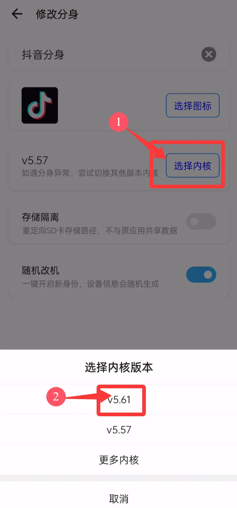 在分身修改界面中,寻找并点击【选择内核】选项。这将打开一个内核选择列表,其中包含了您已下载的所有内核版本。